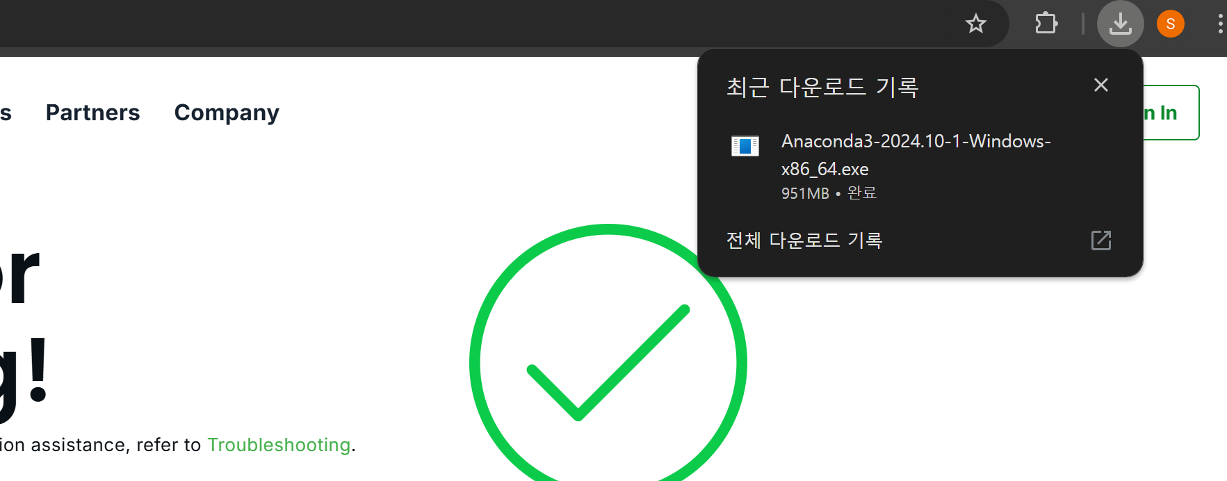 다운로드가 완료되면, 우측 상단의 최근 다운로드 기록을 클릭하거나, 설치파일(exe)이 다운로드된 경로에서 파일을 실행