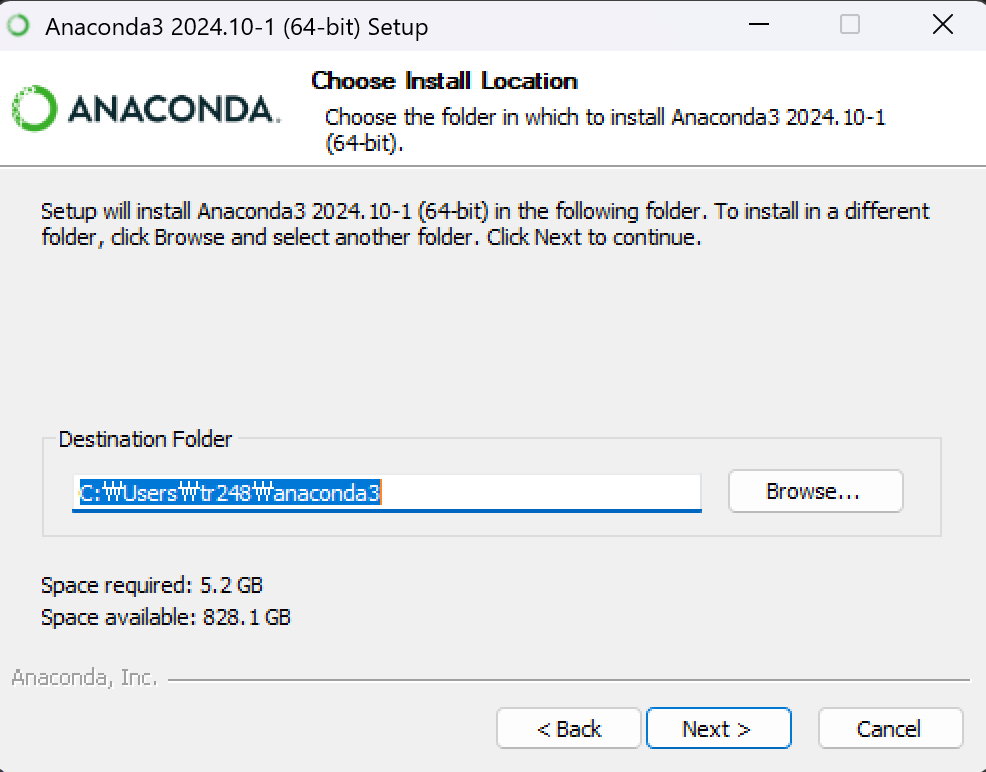 Default경로(C > 사용자(user) >사용자명 > Anaconda)를 선택 후 Next를 클릭