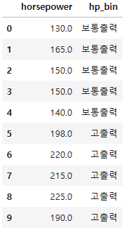 # horsepower_dummies = pd.get_dummies(df["hp_bin"], dtype = float) 결과를 숫자로 나타내고 싶은 경우