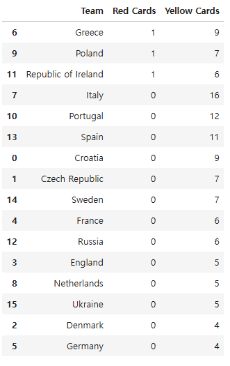 discipline = euro[["Team","Red Cards","Yellow Cards"]]