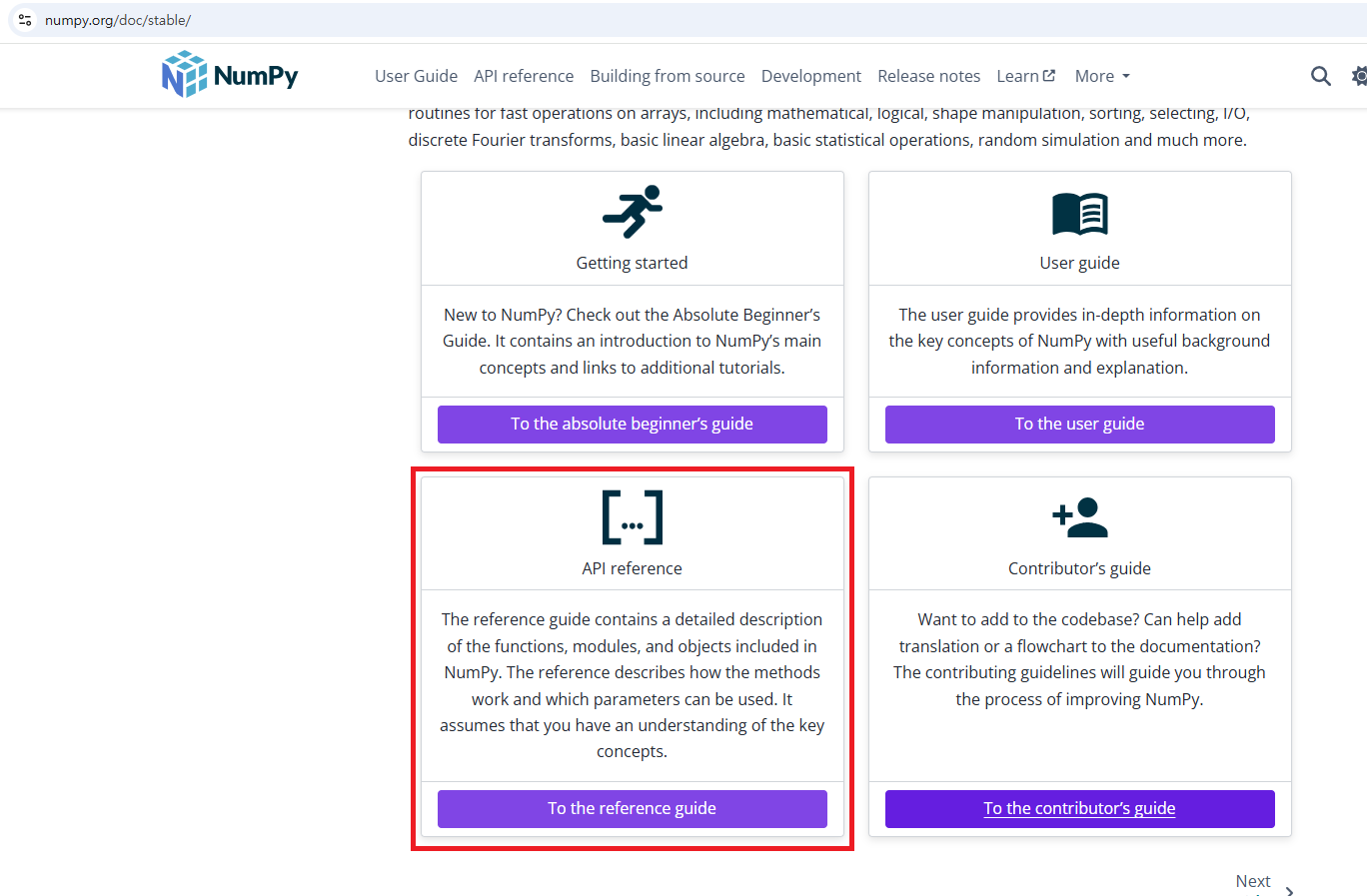 01. 넘파이(NumPy) 공식 홈페이지에 접속후 「Documentation」클릭