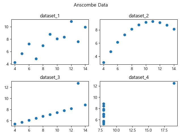- 앤스콤 4분할 데이터는 각각 평균, 분산, 상관관계, 회귀선이 모두 같음