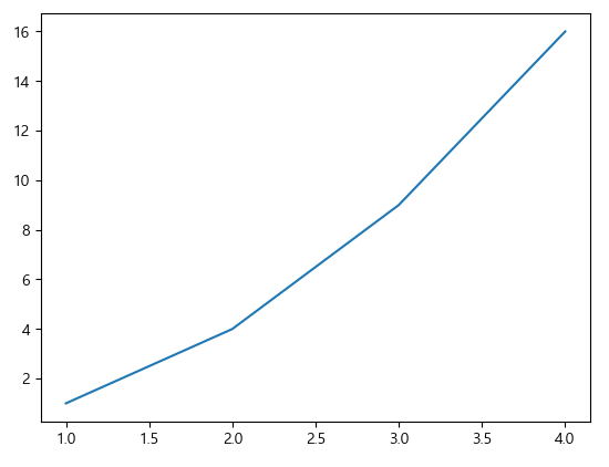 plt.plot([1, 2, 3, 4], [1, 4, 9, 16])