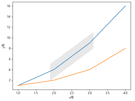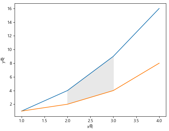 plt.fill_between(x[1:3], y1[1:3], y2[1:3], alpha = 0.5, color = "lightgray") # alpha: 투명도 설정