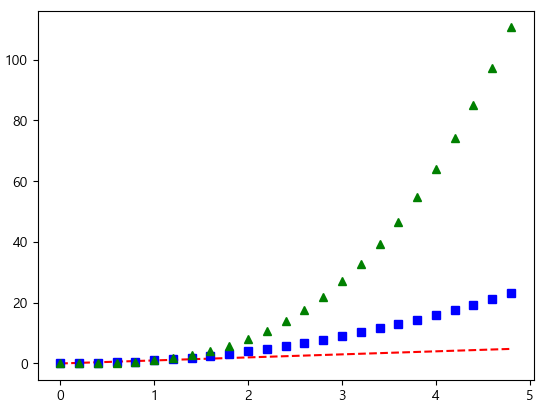 plt.plot(t, t, "r--", t, t ** 2, "bs", t, t ** 3, "g^") # **제곱