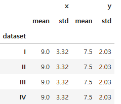 anscombe.groupby("dataset").agg(["mean", "std"]).round(2)