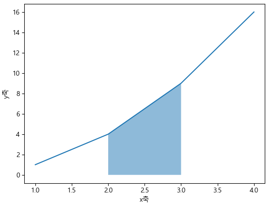 plt.fill_between(x[1:3], y[1:3], alpha = 0.5) # alpha: 투명도 설정