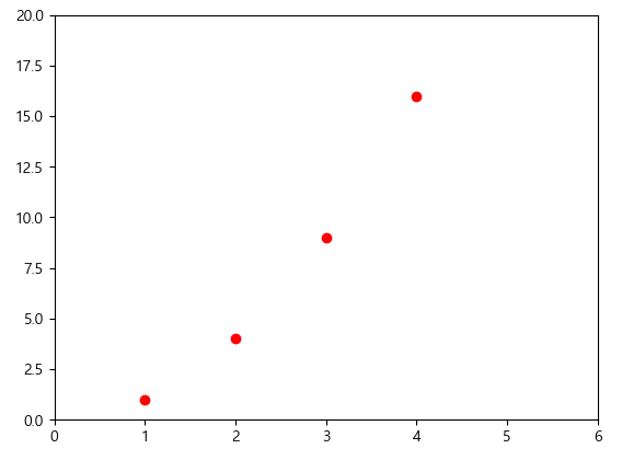 plt.axis([0, 6, 0, 20]) #xmin, xmax, ymin, ymax