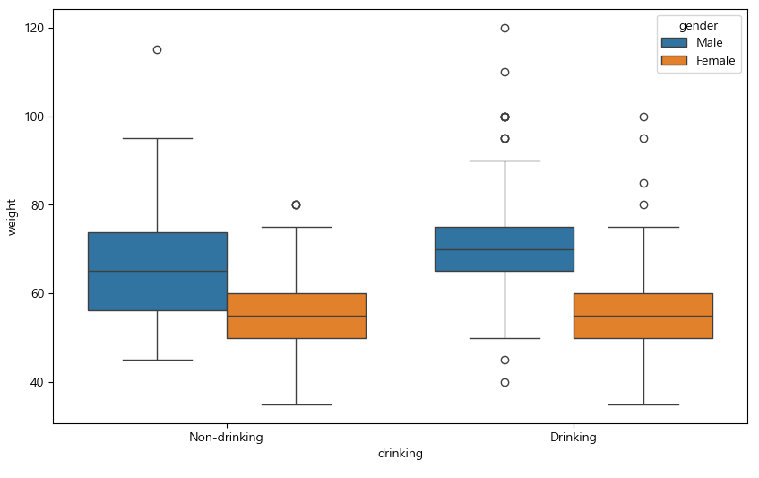 건강검진 데이터 음주 여부와 몸무게 상자수염 그래프
