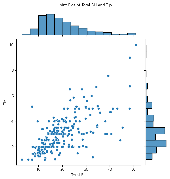 joint.fig.suptitle("Joint Plot of Total Bill and Tip", fontsize = 10, y = 1.03)