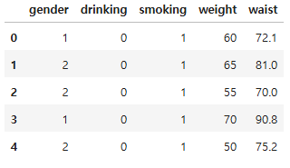 male_data = health.loc[health["gender"] == "Male", ["gender", "weight", "waist", "drinking", "smoking"]]
