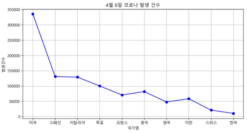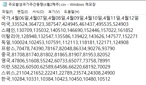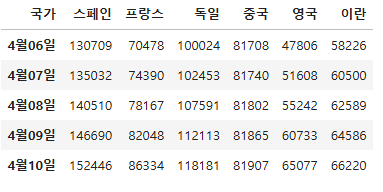 df = pd.read_csv("./data/주요발생국가주간동향(4월2째주).csv", index_col = "국가")
