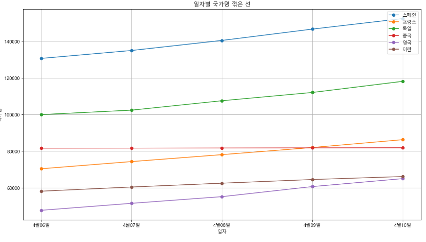 plt.title("일자별 국가명 꺾은 선")