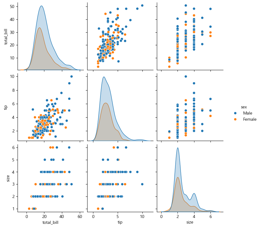 sns.pairplot(tips, hue = "sex")