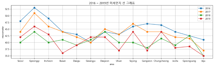 - 2016 ~ 2019년 지역별 미세먼지 선 그래프 그리기