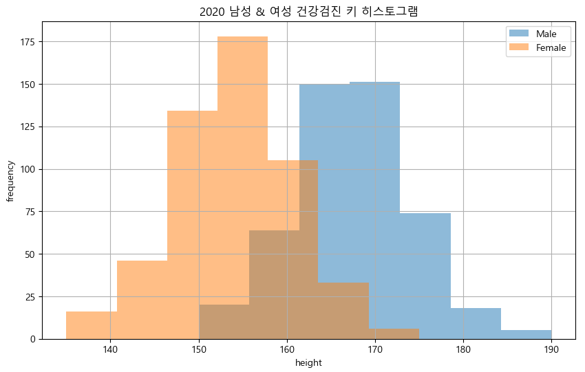 건강검진 데이터 남성과 여성의 허리둘레 히스토그램