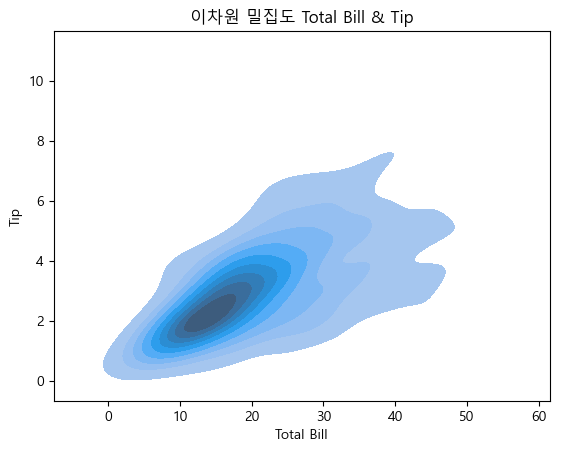 ax.set_title("이차원 밀집도 Total Bill & Tip")