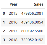 - Year 컬럼을 이용하여 연도별 매출액 합계를 계산