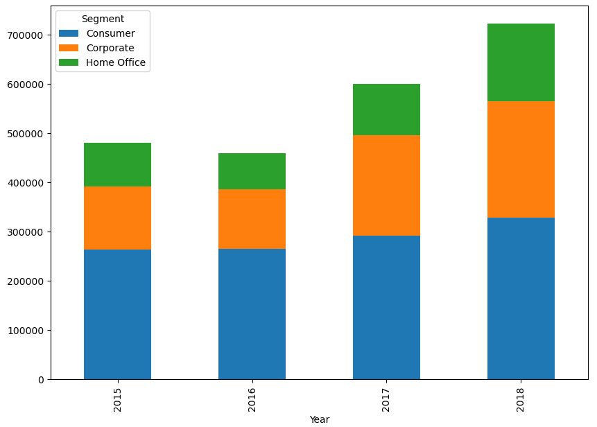 df_bar_2.plot.bar(x = "Year", stacked = True, figsize = (10, 7))