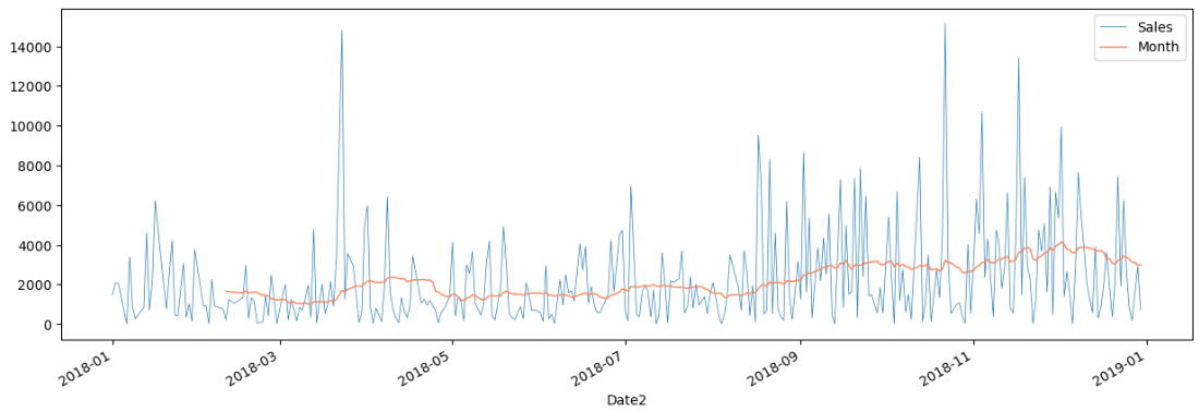 df_line["Month"] = df_line["Sales"].rolling(window = 30).mean() #30일의 평균