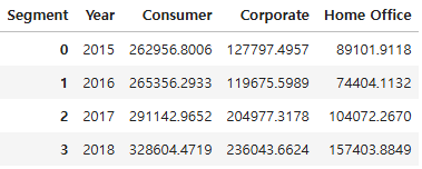 - Segment 컬럼을 활용하여 Consumer, Corporate, Home Office 구분에 따라 매출액을 집계