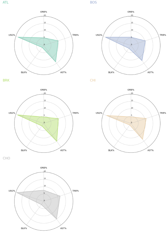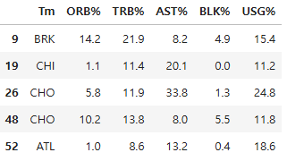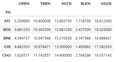 df1 = df1[["Tm", "ORB%", "TRB%", "AST%", "BLK%", "USG%"]]