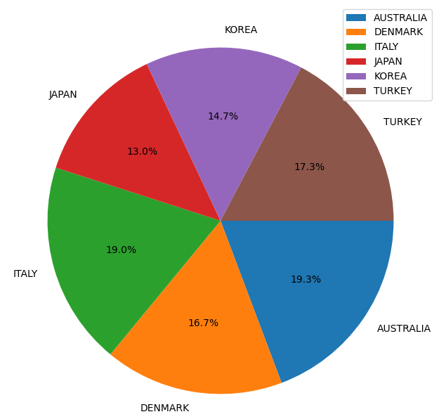 plt.pie(df2["height_cm"], labels = df2["country"], autopct = "%.1f%%", startangle = 90,