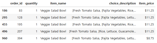 salad_df = chipo[chipo["item_name"] == "Veggie Salad Bowl"]
