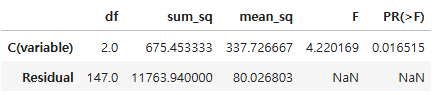 - pvalue가 0.05보다 작으므로, 3개의 집단 중 최소한 하나의 집단은 통계적으로 유의미한 차이가 있음