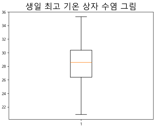 ax.set_title("생일 최고 기온 상자 수염 그림", size = 20)