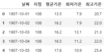 df.columns = ["날짜", "지점", "평균기온", "최저기온", "최고기온"]