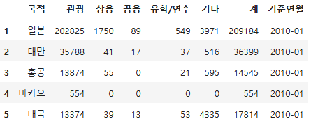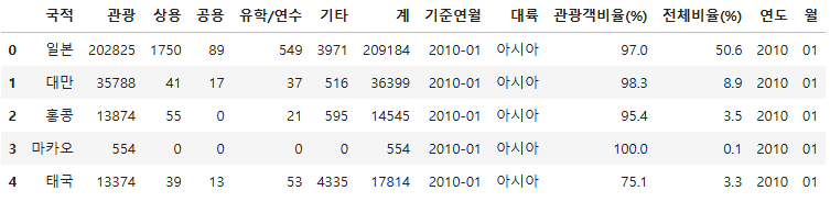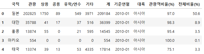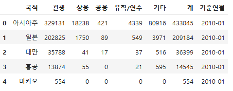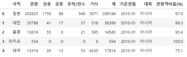 kto_201001 = pd.read_excel("./data/외국인관광객_실습데이터/kto_201001.xlsx",