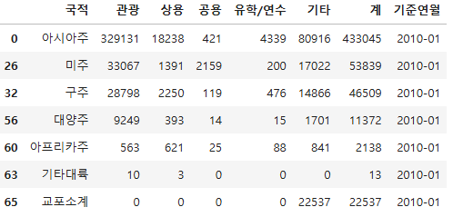 kto_201001[(kto_201001["관광"] == 0) | (kto_201001["상용"] == 0) |(kto_201001["공용"] == 0) | (kto_201001["유학/연수"] == 0) | (kto_201001["기타"] == 0)]