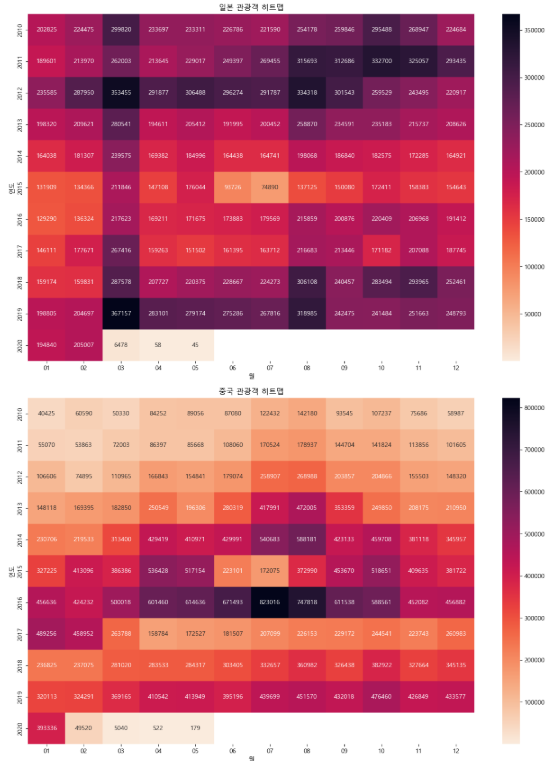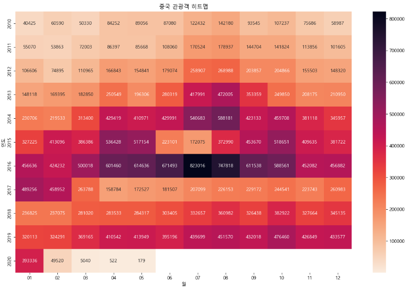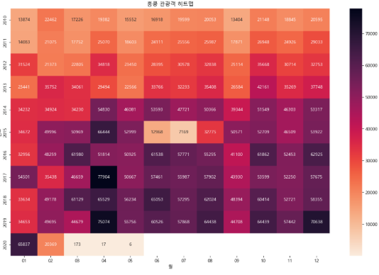 - x축에 month, y축에 year를 넣고 내용에는 관광객 숫자가 들어가는 히트맵