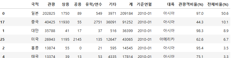 kto_201001_country_newindex["관광객비율(%)"] = round((kto_201001_country_newindex["관광"] / kto_201001_country_newindex["계"])*100, 1)