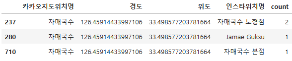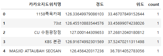 location_data = location_data.groupby(["카카오지도위치명", "경도", "위도"])[["count"]].sum()