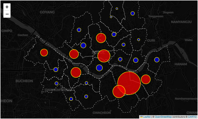 - 인구 단계구분도에서 인구가 적은 지역으로 표시되었던 중구와 종로구가 1만명당 매장 수가 가장 많은 것으로 표시됨