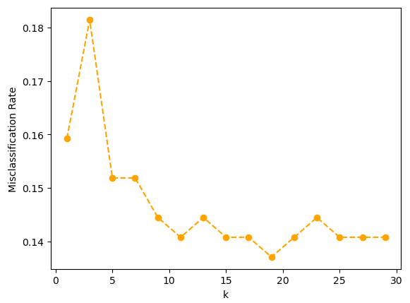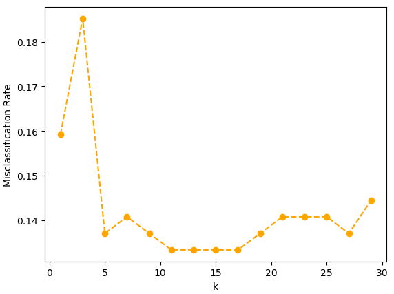 - 거리 가중치를 적용하지 않은 모델에서 k 이웃 수를 1에서 30까지 늘려가며 KNN모델의 오분류율을 시각화