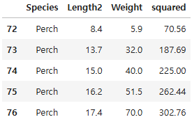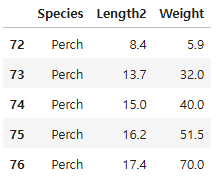 df = df.loc[df["Species"] == "Perch", ["Species", "Length2", "Weight"]]