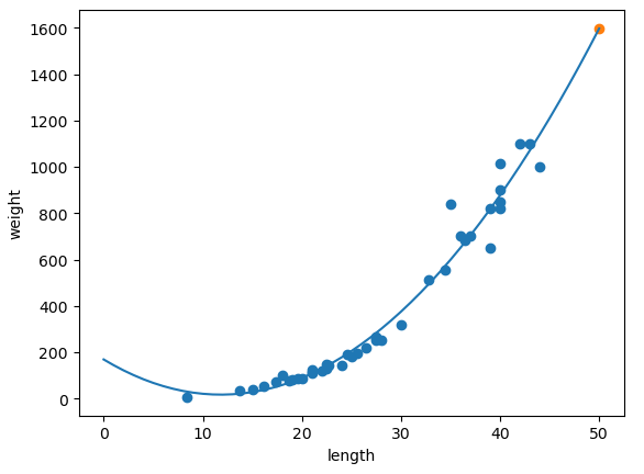 - 실제 농어의 무게는 일직선 이라기 보다는 왼쪽 위로 구부러진 곡선에 가깝기 때문에 직선보다는 곡선으로 예측하는 것이 더 적합