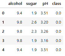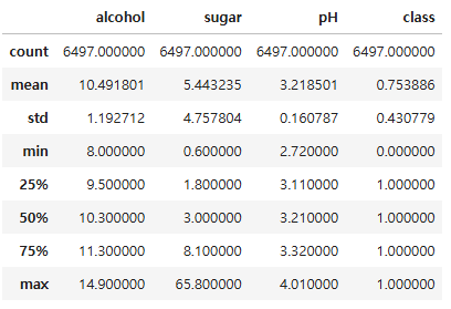 - class: 타깃 값. 0이면 레드와인, 1이면 화이트 와인