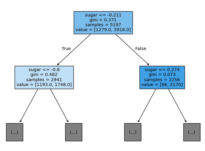 plot_tree(dt, max_depth = 1, filled = True, feature_names = ["alcohol", "sugar", "pH"])