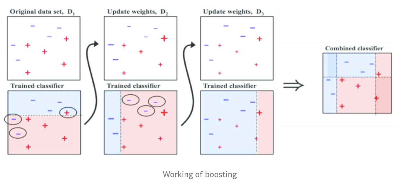- 계속하여 분류기에게 가중치를 부스팅하며 학습을 진행하기 때문에 부스팅 방식이라고 불림