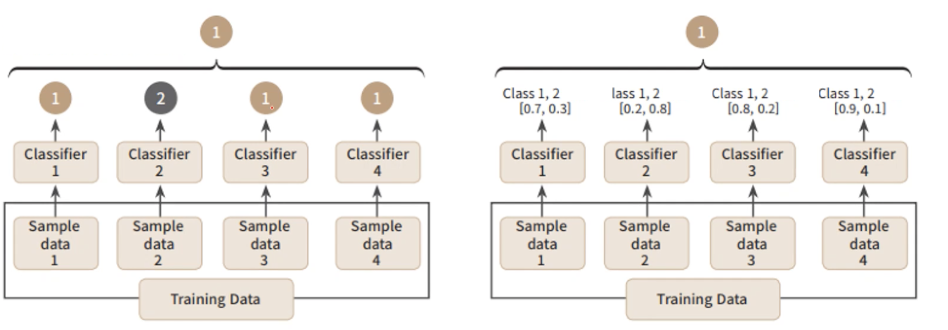 - 모든 분류기가 예측한 결정 확률의 평균이 가장 높은 결과값을 최종 결과로 선정