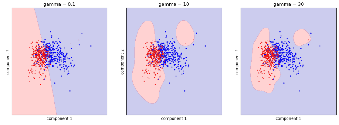 - gamma 값이 커지면 여러 개의 결정경계선이 생기게 될 수 있음