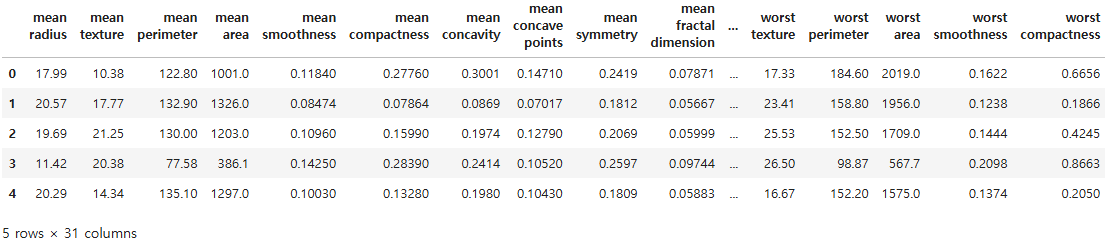 df = pd.DataFrame(cancer["data"], columns = cancer["feature_names"])
