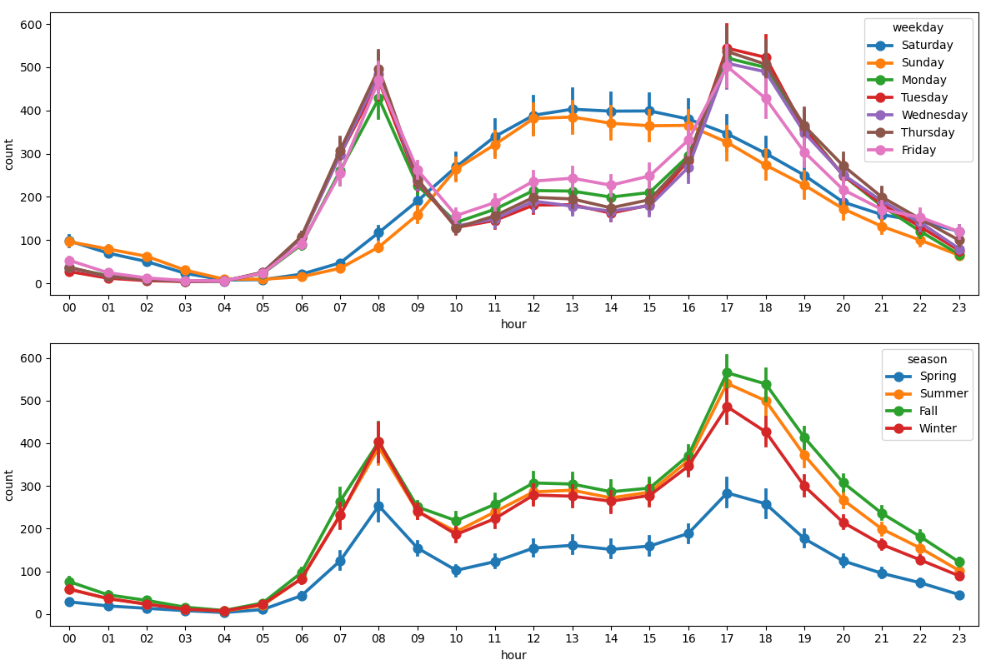 - 근무일에는 출퇴근 시간에 대여량이 많고 쉬는 날에는 오후 12 ~ 2시에 대여량이 많음