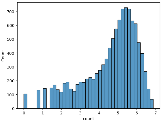 sns.histplot(np.log(train_df["count"]))