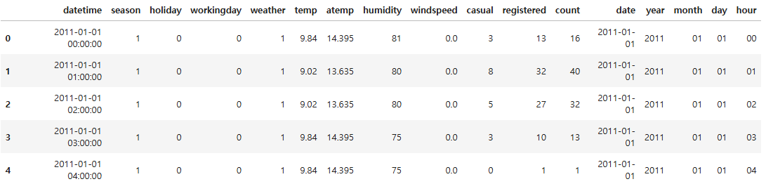 - datetime 컬럼은 여러 정보의 혼합체이기 때문에 각각 연도, 월, 일, 시간 컬럼으로 분리