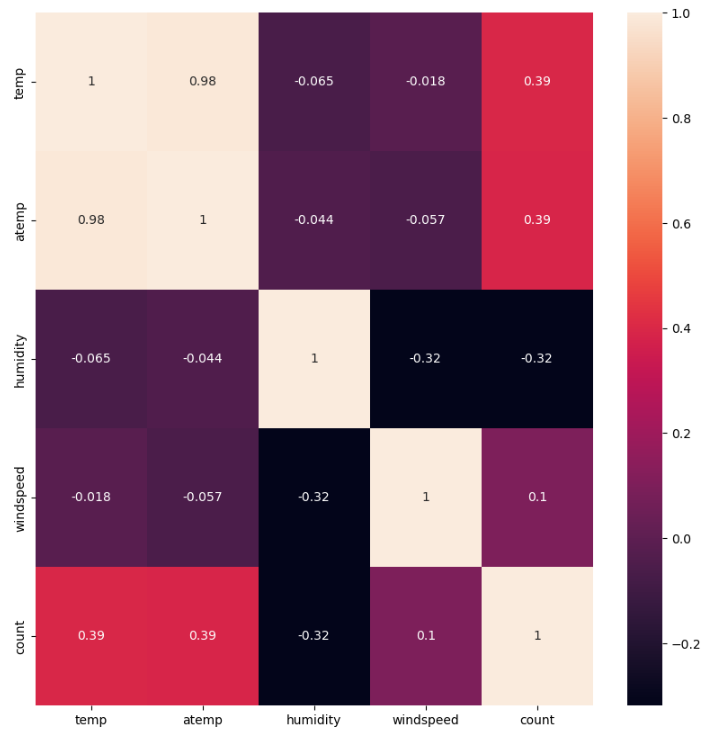 # windspeed의 상관계수가 0.101369 으로 제거하는게 나을 수 있음